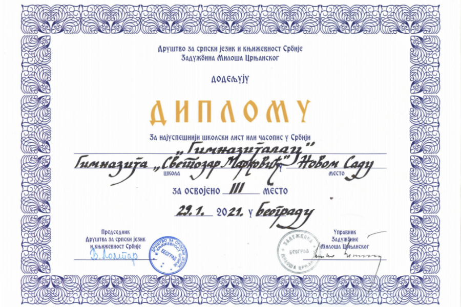 Gymnázium Svetozara Markovića Nový SadV starej časti mesta Nový Sad, v jednej z najznámejších školských budov, v budove – kultúrnej pamiatke – postavenej v roku 1895 v štýle historizmu je Gymnázium Svetozara Markovića. V esteticky riešenom a moderne vybavenom priestore prebieha vyučovací proces aj mimoškolské aktivity zamerané na optimálne podnecovanie každého žiaka k jeho celkovému harmonickému, intelektuálnemu, emocionálnemu a sociálnemu rozvoju. Budovu, v ktorej sa gymnázium nachádza, navrhol vtedajší známy architekt Bela Peklo, inak autor projektu niekoľkých známych architektonických stavieb v Novom Sade. Už 127 rokov po sebe slúži táto budova na výchovno-vzdelávacie účely. Od postavenia zariadenia v ňom sídlilo Štátne ženské gymnázium, po druhej svetovej vojne Geodetická škola, potom Základná škola Petra Petrovića Njegoša a od roku 1964 do roku 1978 Gymnázium Svetozara Markovića. Zavedením odborného školstva od roku 1979 do roku 1993 bola v tej istej budove aj Pedagogická škola a od roku 1990 bola na rovnakom mieste obnovená práca gymnázia.